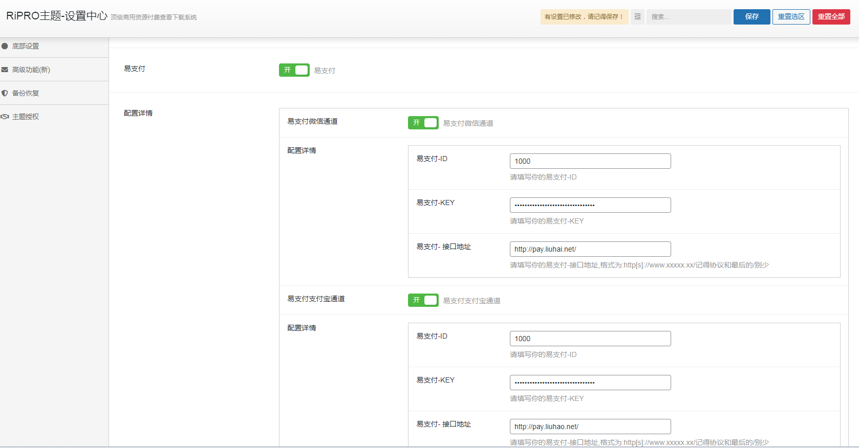 4.填写到你选择的易对应的ID 秘钥 和 易平台的接口地址,然后点击保存即可,这样就配置好了。 -