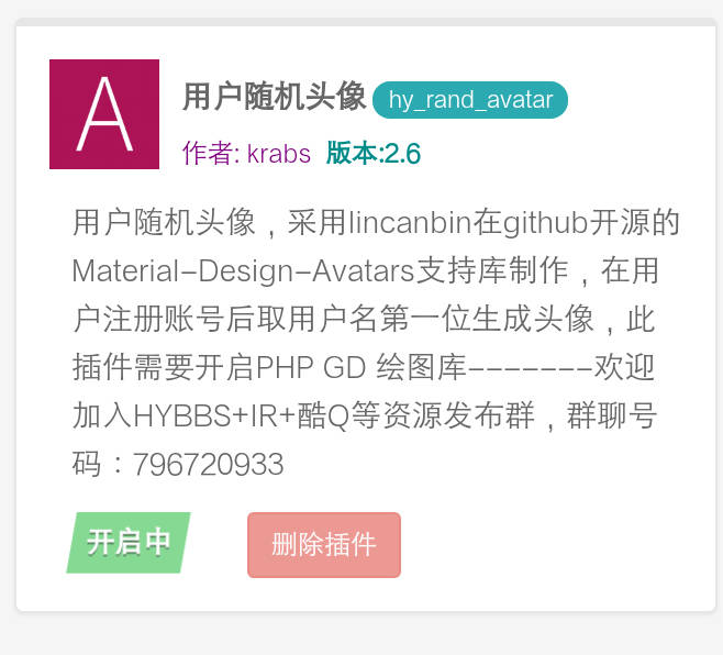 用户随机头像,采用lincanbin在github开源的Material-Design-Avatars支持库制作,在用户注册账号后取用户名第一位生成头像,此插件需要开启PHP GD 绘图库!